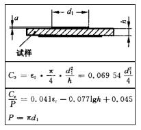 電極可選用5.1.3中任意一種。如果不用保護環(huán),而且試樣上下的兩個電極難以對齊時,其中一個電極應比另一個電極大些。已經加有電極的試樣應放置在兩個金屬電極之間,這兩個金屬電極要比試樣上的電極稍小些。對于平板形和圓柱形這兩種不同電極結構的電容計算公式以及邊緣電容近似計算的經驗公式由表1給出。