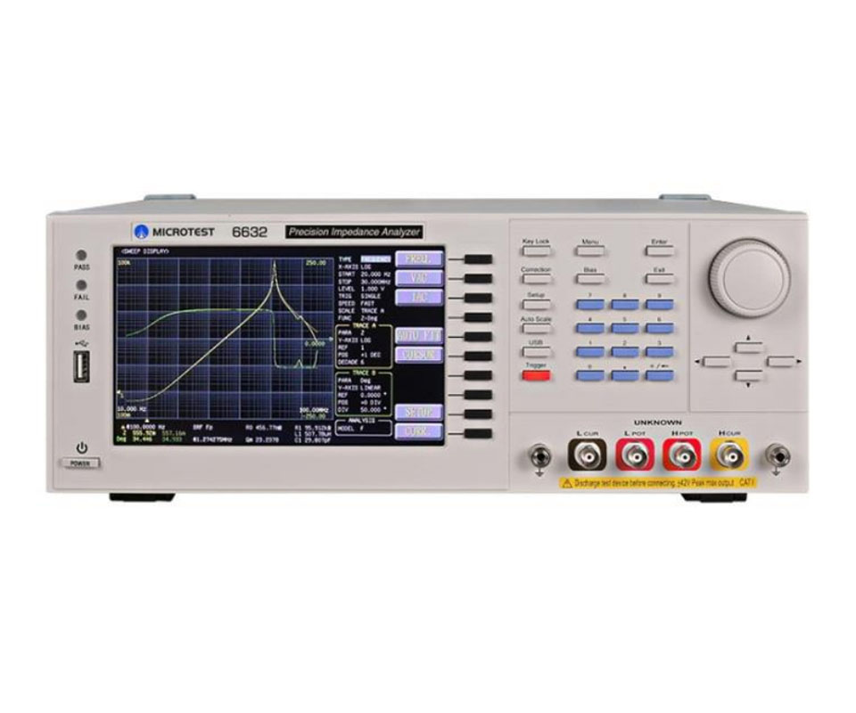 6632 精密阻抗分析儀,提供 6 種頻率選項(xiàng)(10 Hz 至1/3/5/10/20/30 MHz),可以進(jìn)行交流信號(hào)的LCR測(cè)試,測(cè)試頻率和測(cè)試級(jí)別可進(jìn)行連續(xù)變化的階段測(cè)量。可在不同測(cè)試、模式條件下、進(jìn)行高速地連續(xù)測(cè)試。提供輸出阻抗25?/100?可切換,ALC補(bǔ)償,多步測(cè)試;BIN 分類及比較器功能在自動(dòng)元件生產(chǎn)時(shí)進(jìn)行良品與不良品分類。內(nèi)建直流偏置電壓±12V,并可選購?fù)鈷熘绷髌秒妷?電流 0到±40V/±100mA,精準(zhǔn)量測(cè)壓電陶瓷材料之導(dǎo)納圓繪圖,提供量測(cè)電容之直流電壓特性;及選購等效電路分析功能支援7種不同的參數(shù)模型(三元件、四元件),可協(xié)助客戶模擬元件的等效參數(shù)值??纱钆?6210, 6220,或6240直流偏流源測(cè)試系統(tǒng)。且支援RS-232、GPIB、Handler、LAN、USB Host/Device 等介面。